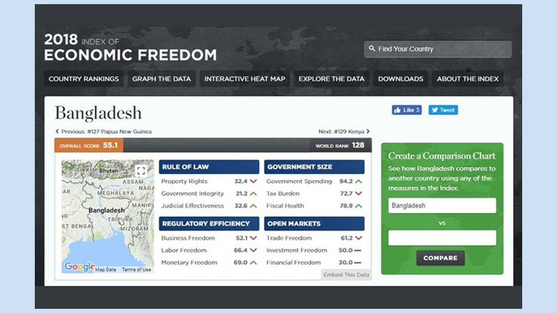 Bangladesh’s economic freedom score is 55.1, making its economy the 128th freest in the Economic Freedom Index-2018 released by the Heritage Foundation, reports BSS.